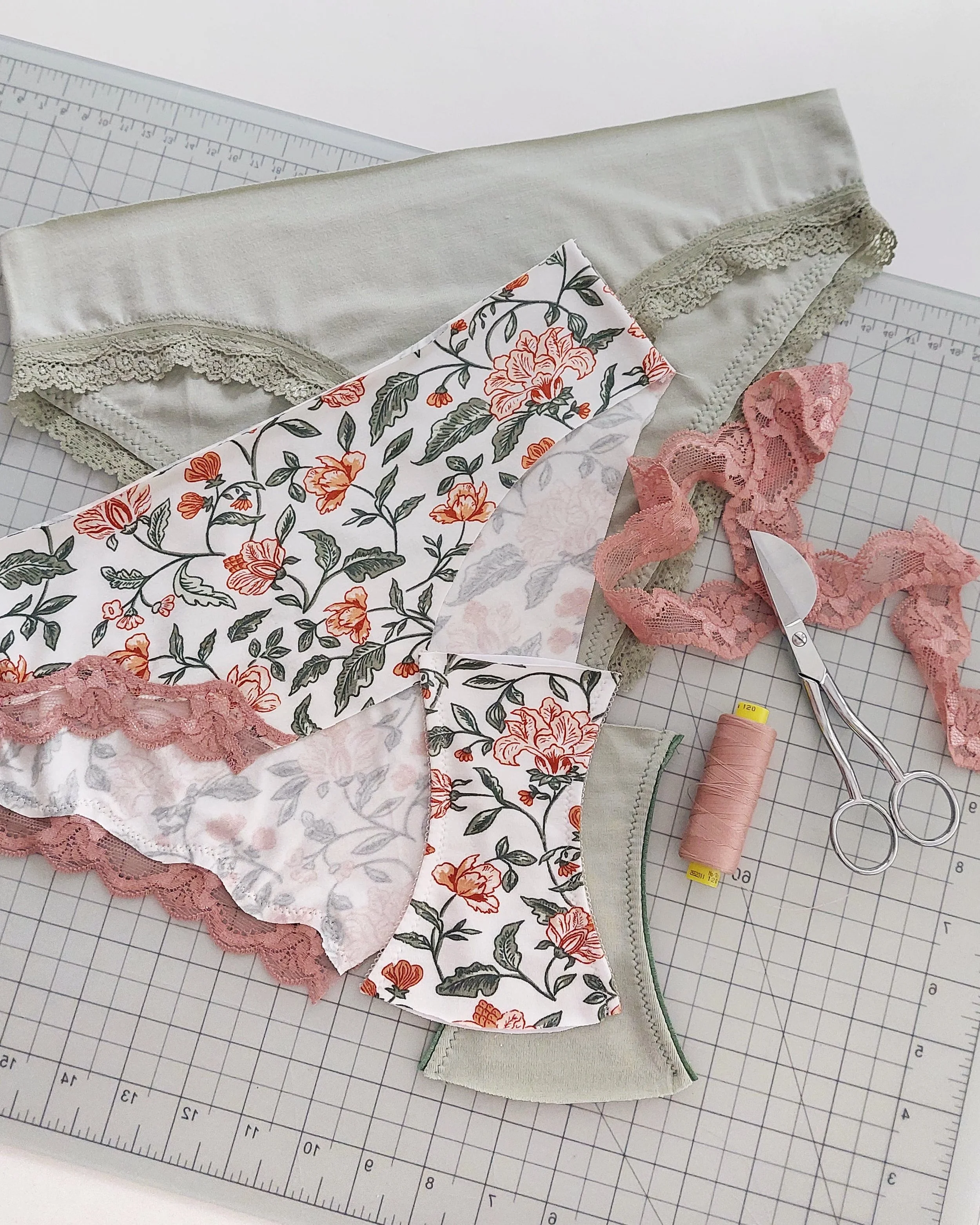 In the e-book about modifications for panties patterns (a free resource that you can download when you sign up for my newsletter here), there is already a tutorial about how to sew these lace trims in a circle, but in this tutorial, I will show you how to do it so that the crotch piece is separate.