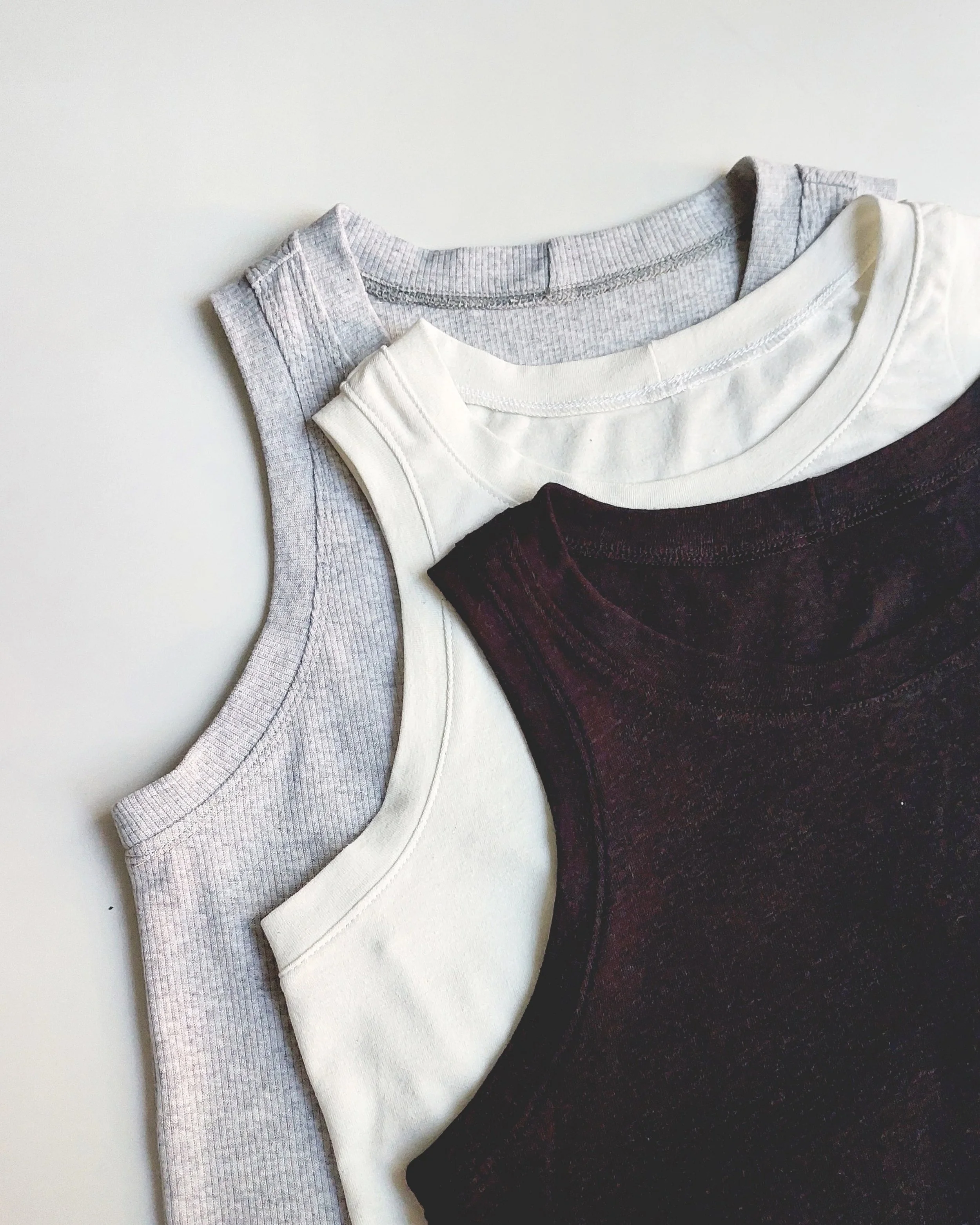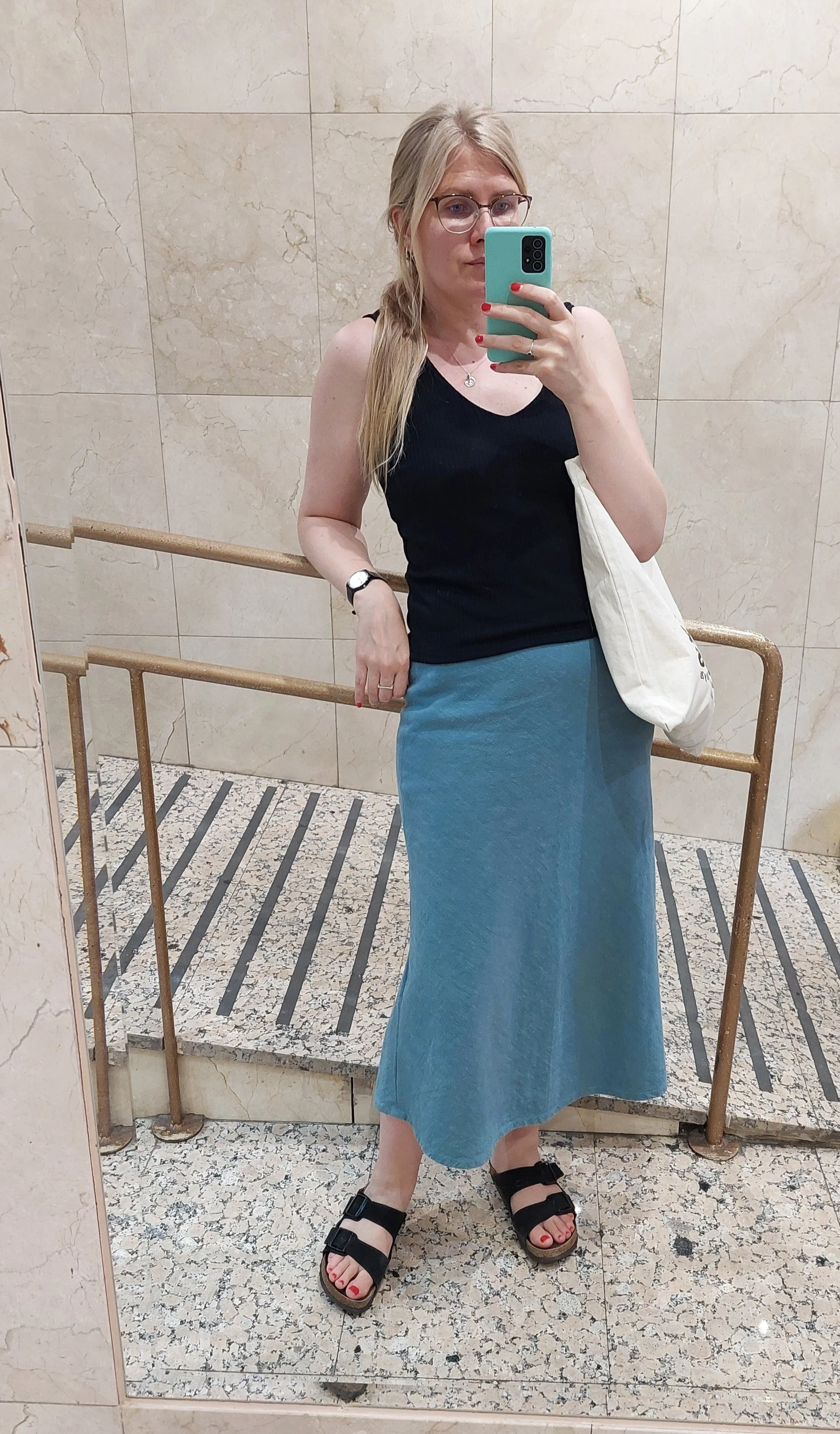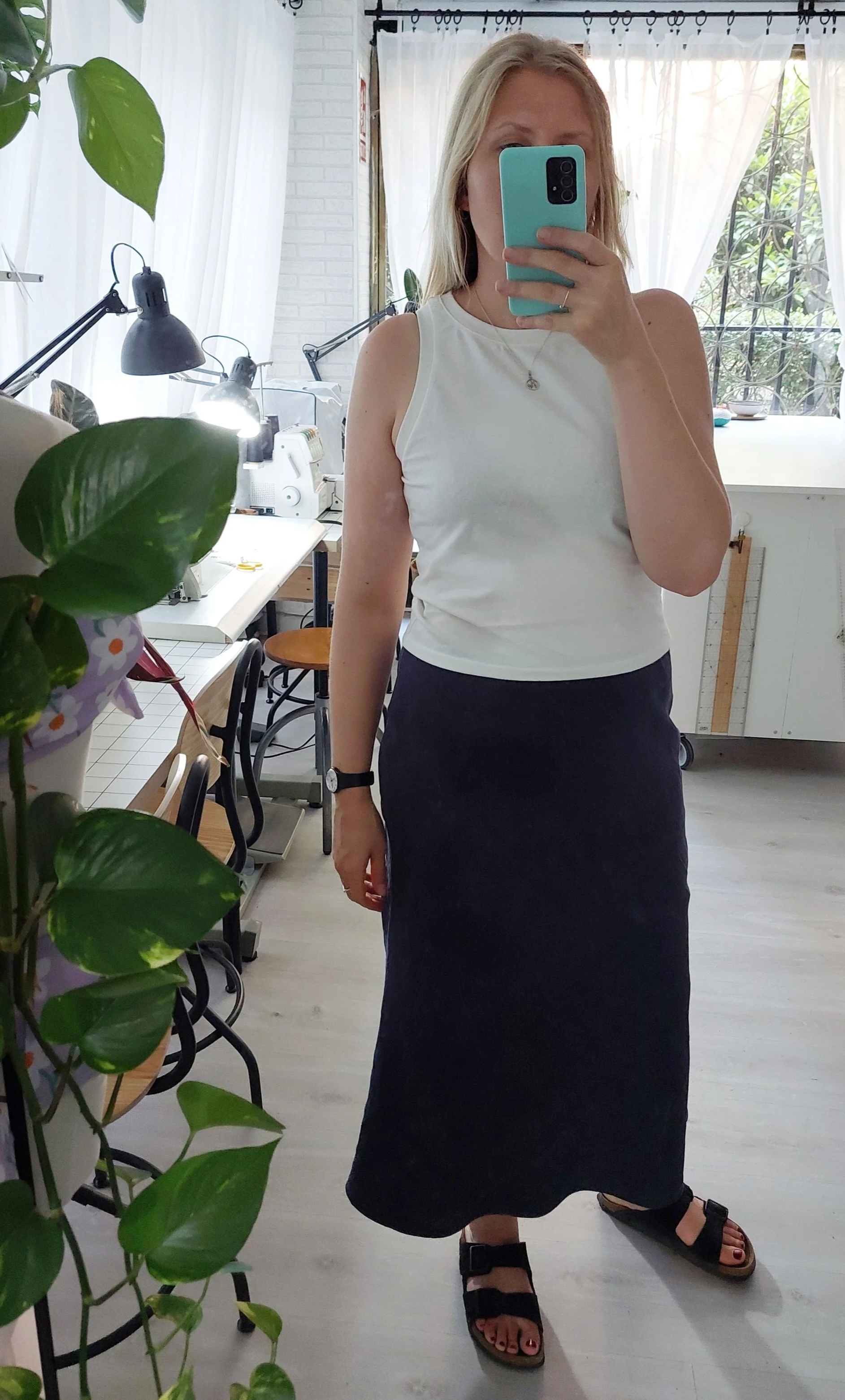 I made two other linen skirts with the same bias pattern too. The lighter stone-washed linen is from Cal Joan (online) and the darker blue from Ribes i Casals in Madrid (check the Madrid fabric shopping guide here) . On the right, it’s worn with a black rib knit Weiland tank (pattern by Elbe Textiles), which was a garment I wore so much this year. On the left, it’s worn with a white linen jersey knit Blomma tank (a free pattern by Paradise Patterns); the fabric is from Cal Joan. I also made another Blomma tank with grey rib knit and a black linen knit.