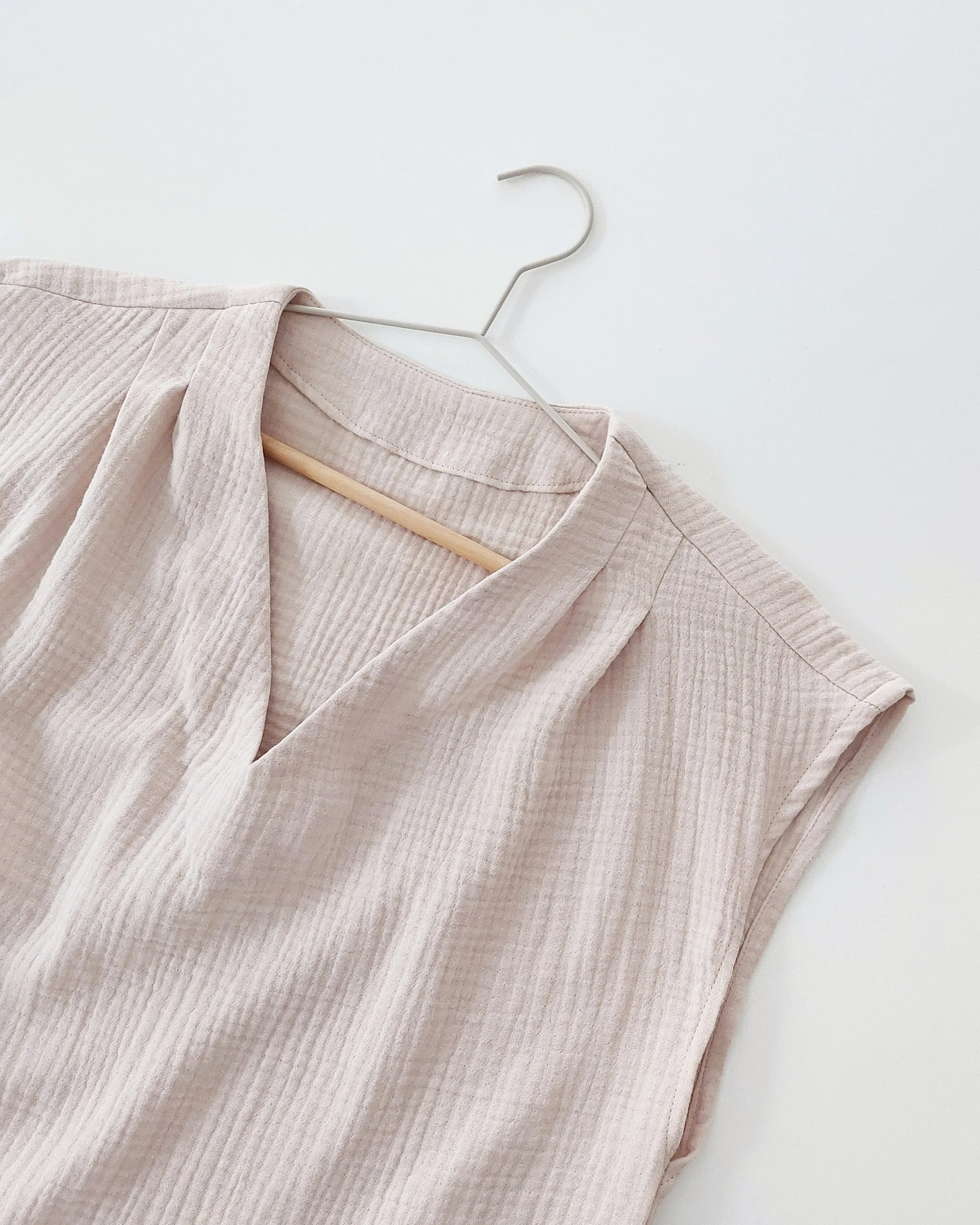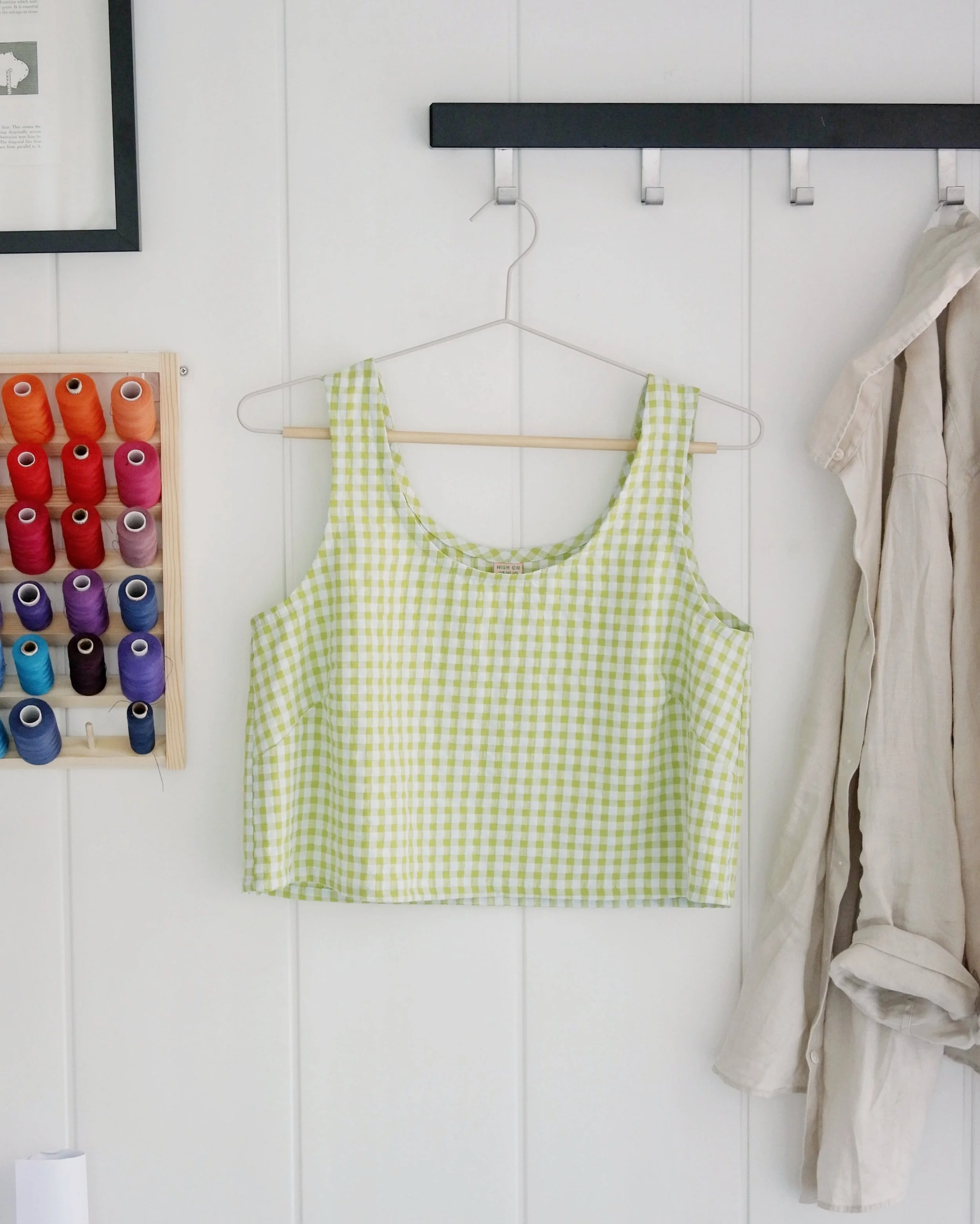 Hice dos blusas utilizando patrones gratuitos, luego se han quedado como muestras de clase. La beige es una versión de doble gasa del patrón Declic de Atelier Scammit, y la verde de cuadros vichy es la parte superior del vestido Bardon, un patrón de Peppermint Magazine diseñado por Elbe Textiles (era gratuito cuando lo hice, pero ya no lo es).