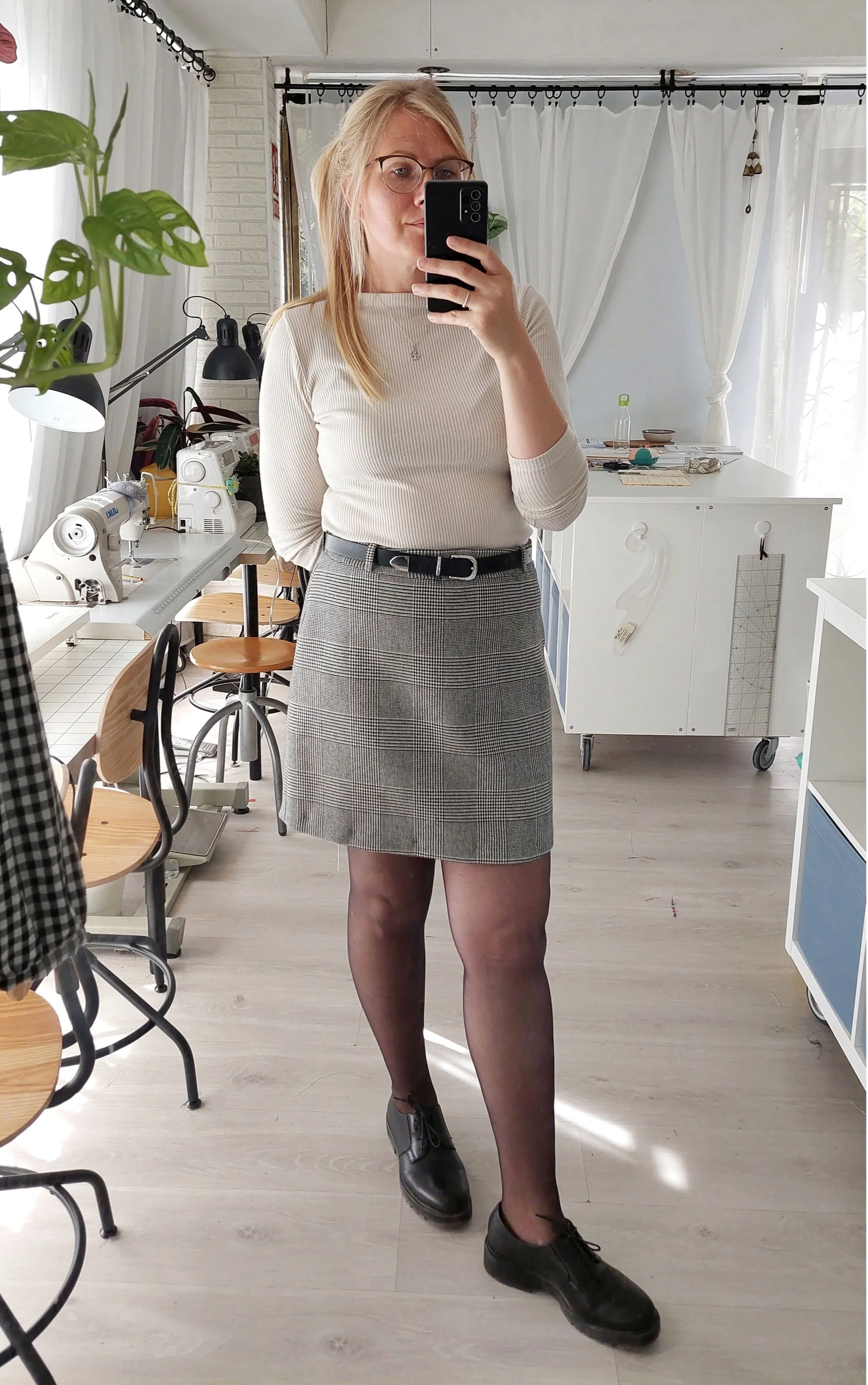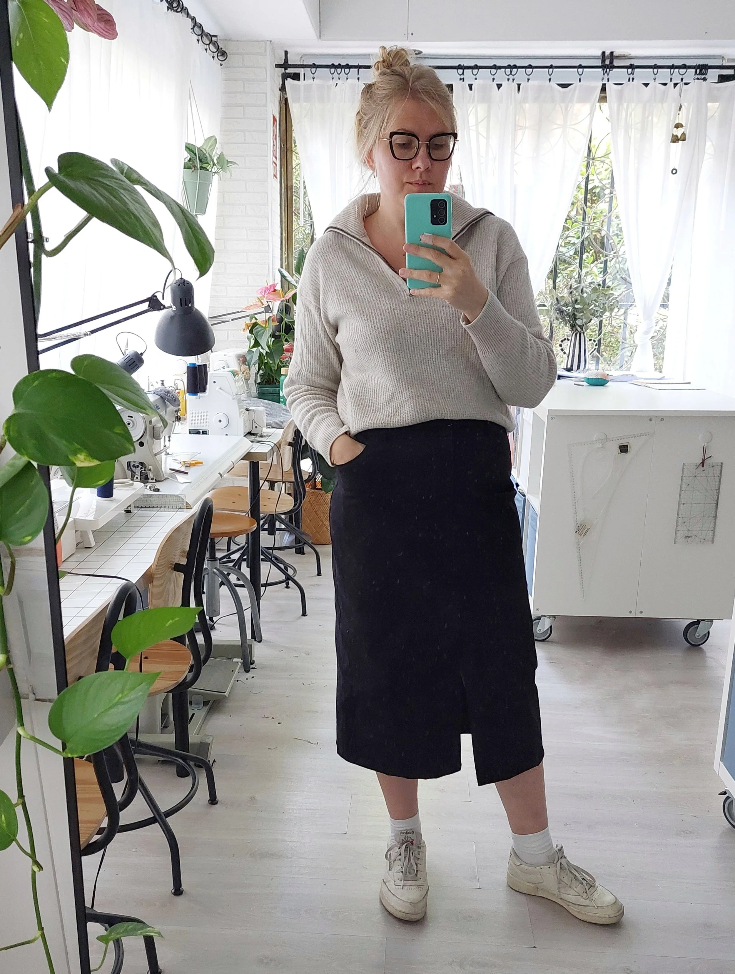 Las otras dos faldas que hice este año las cosí durante el curso de patronaje. La de cuadros (con tela de Teixits i Retalls) está hecha con mi patrón base a medida, y la negra es una copia de una falda comprada (con sarga elástica de Ratucos), también adaptada a mi patrón. Por fin, unas faldas estructuradas con cinturillas que no se suben al llevarlas puestas, porque la medida entre la cintura y la cadera es la correcta.