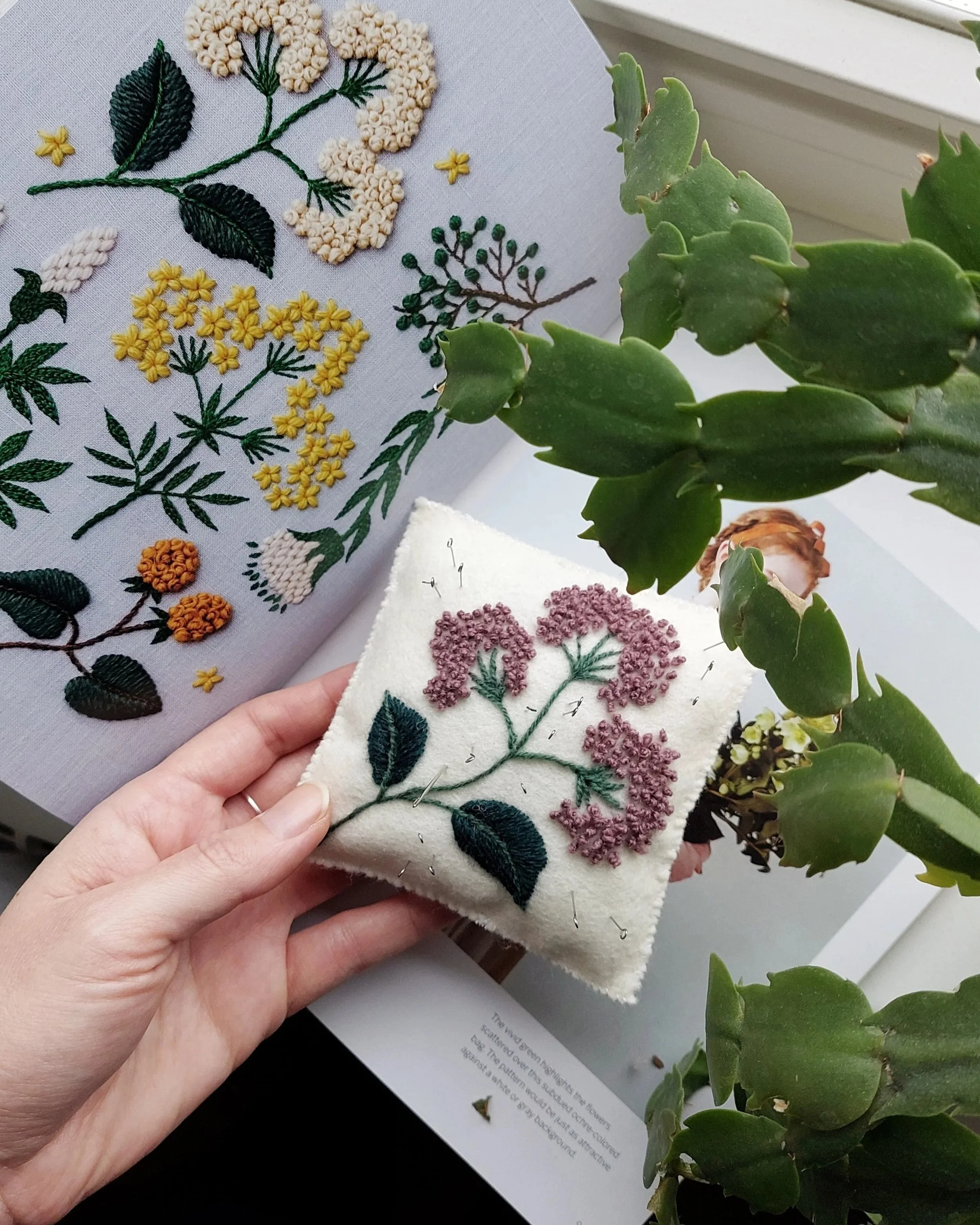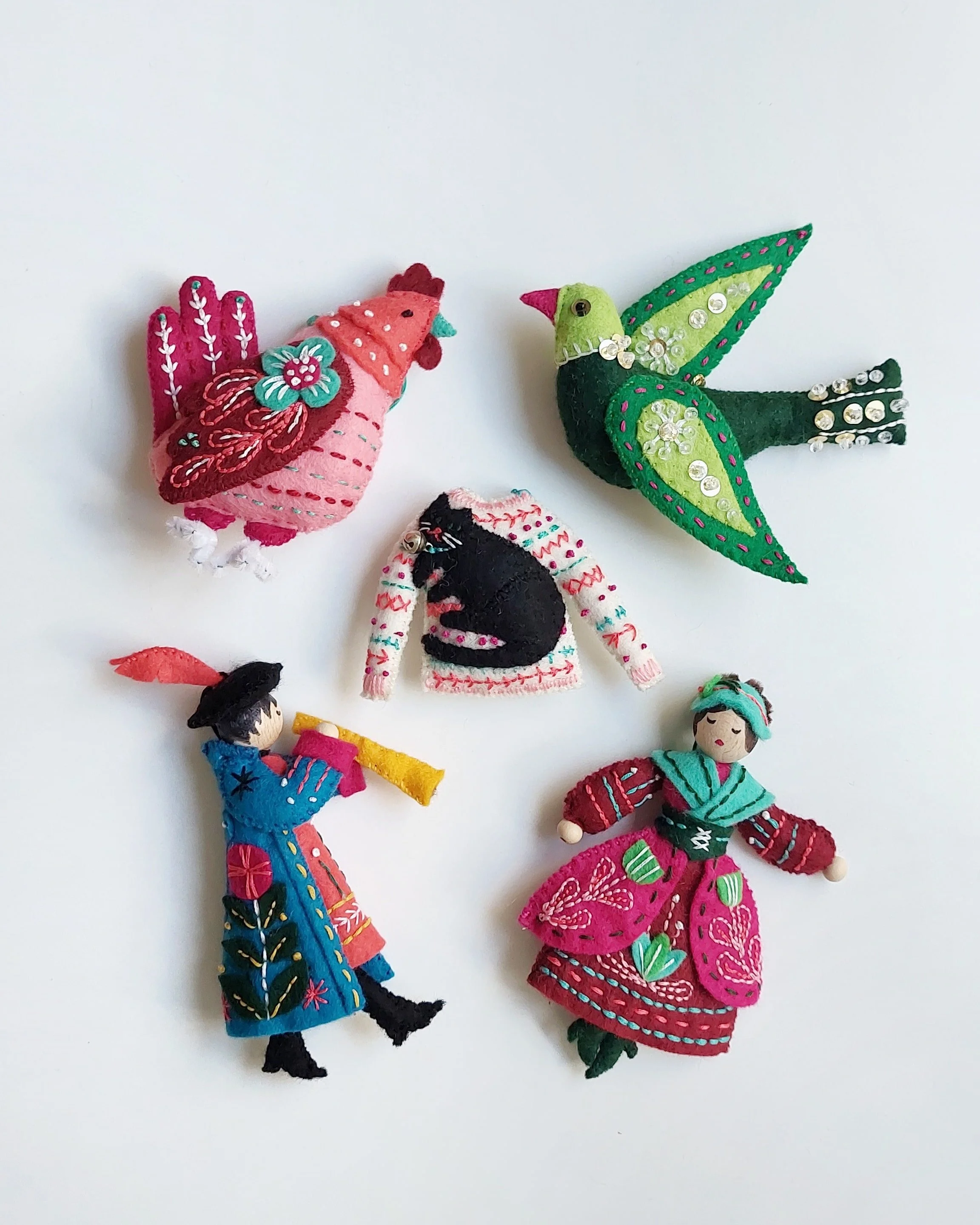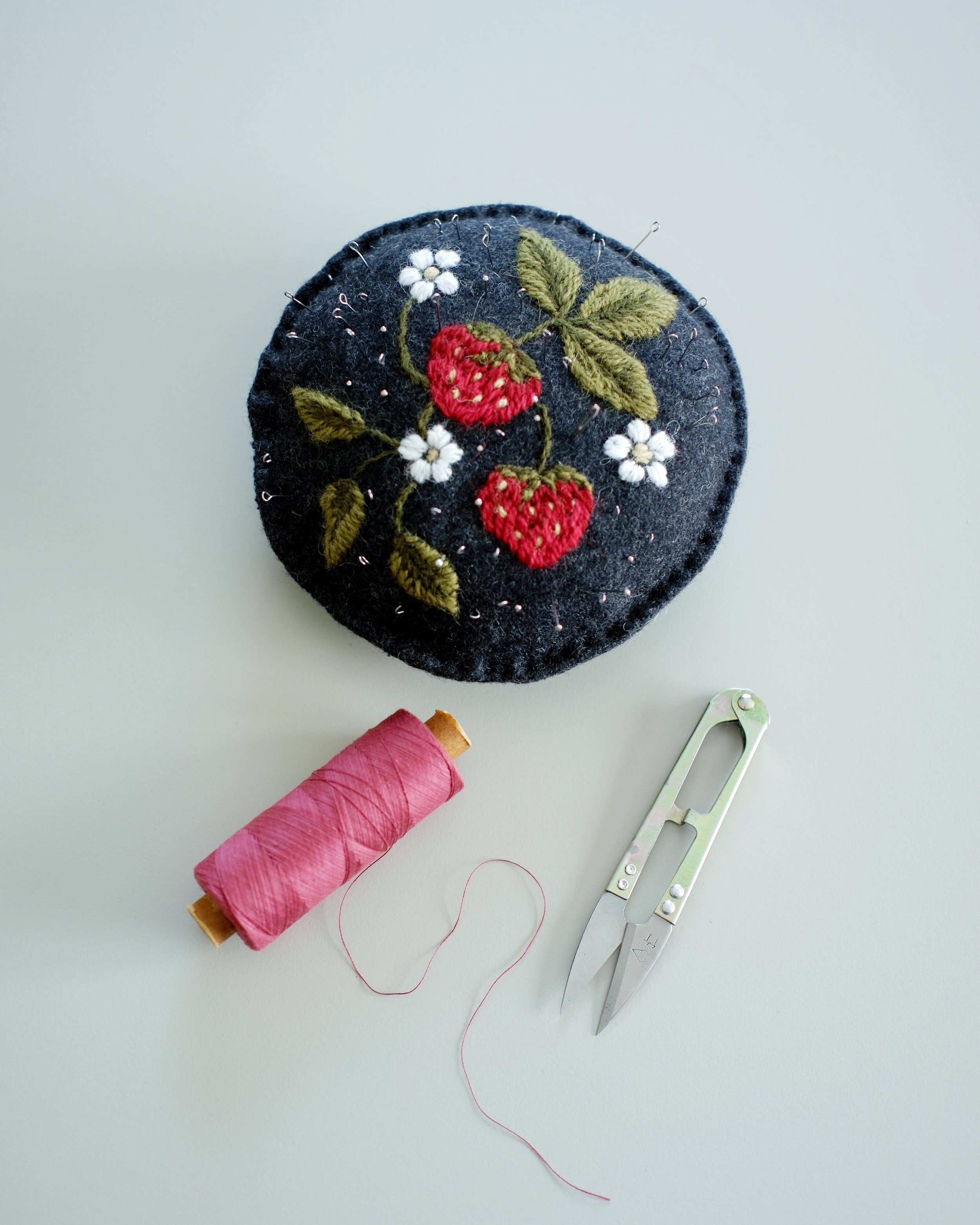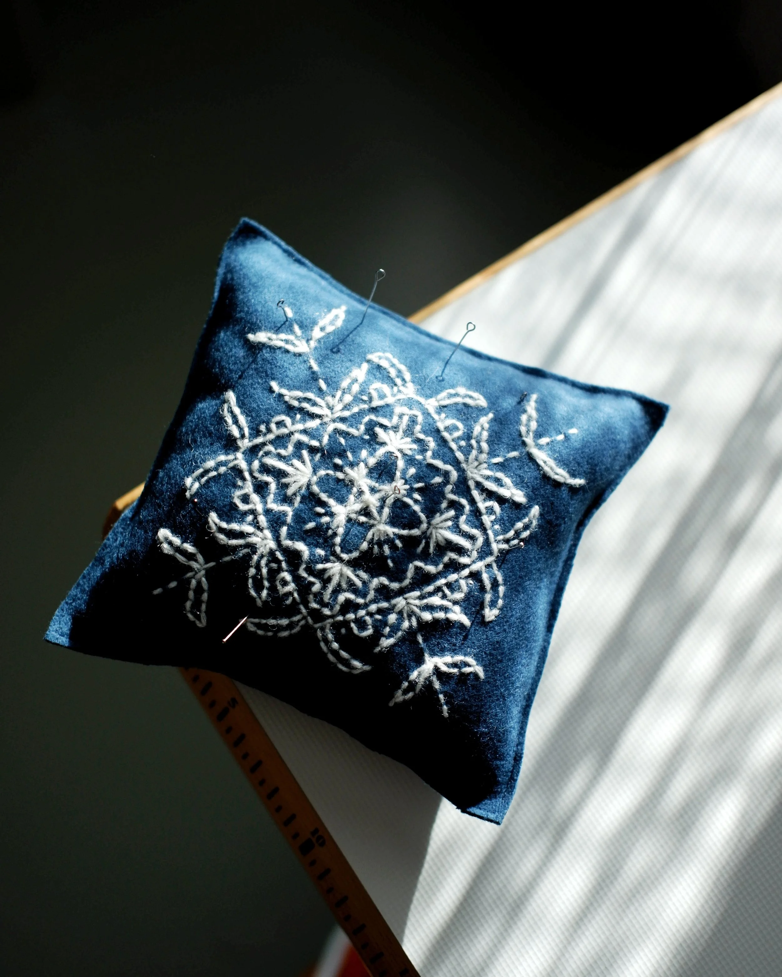 I used patterns from a book by Yumiko Higuchi that I got for my birthday (at Panta Rhei bookshop in Madrid they have many of her beautiful books), making one ornament and one pincushion. I love working with wool felt for these projects—it’s sturdy and makes a great base for this kind of work.