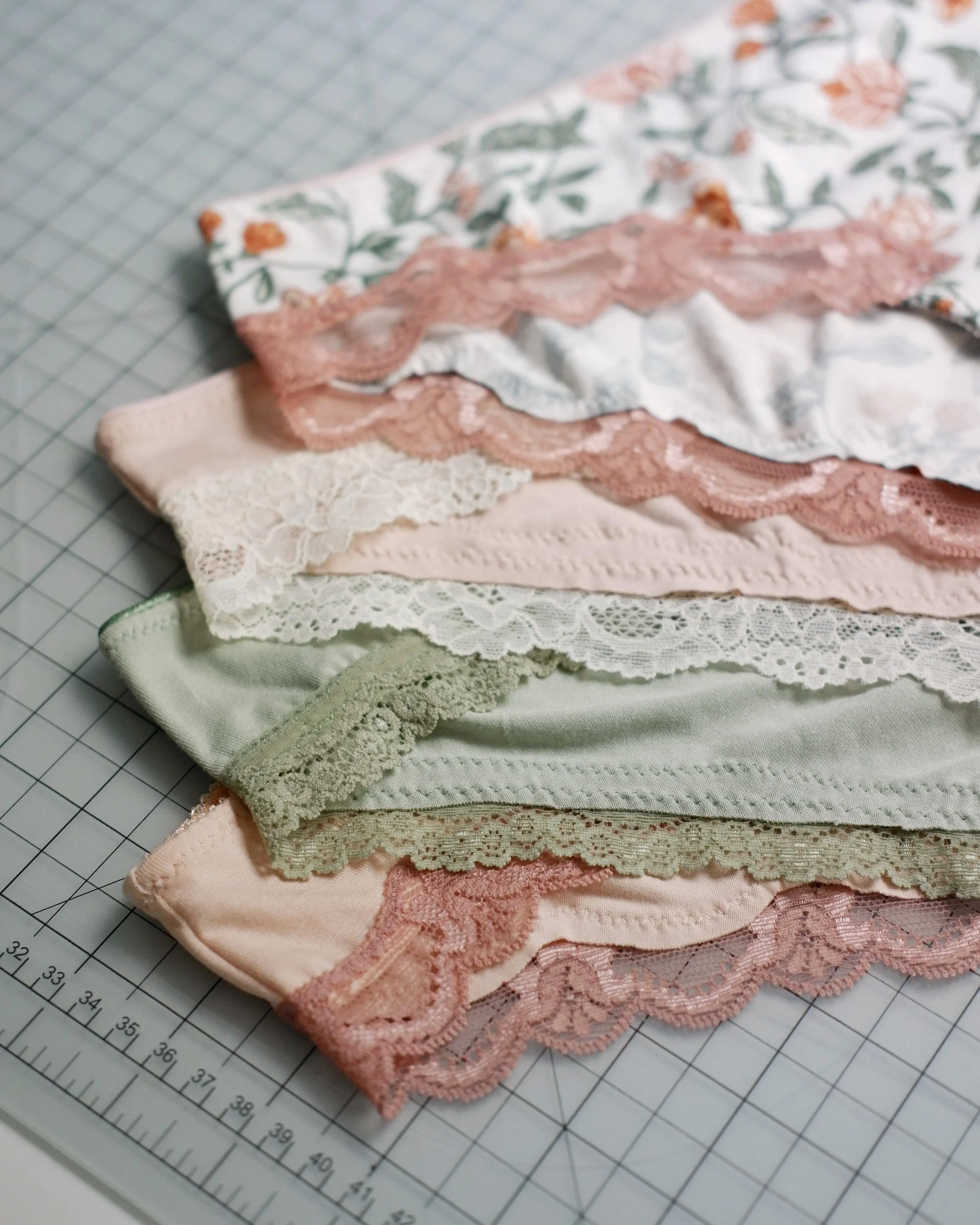 As someone who works a lot with lingerie sewing, I didn’t sew much of it for myself this year (it’s mostly samples and things not in my size). I did do some batch sewing of knit undies with narrow lace trim for myself, as I also made a tutorial about it, and that was a good way to finally get some new ones. I used Vera panties sewing pattern with bamboo and Tencel knits from my shop.