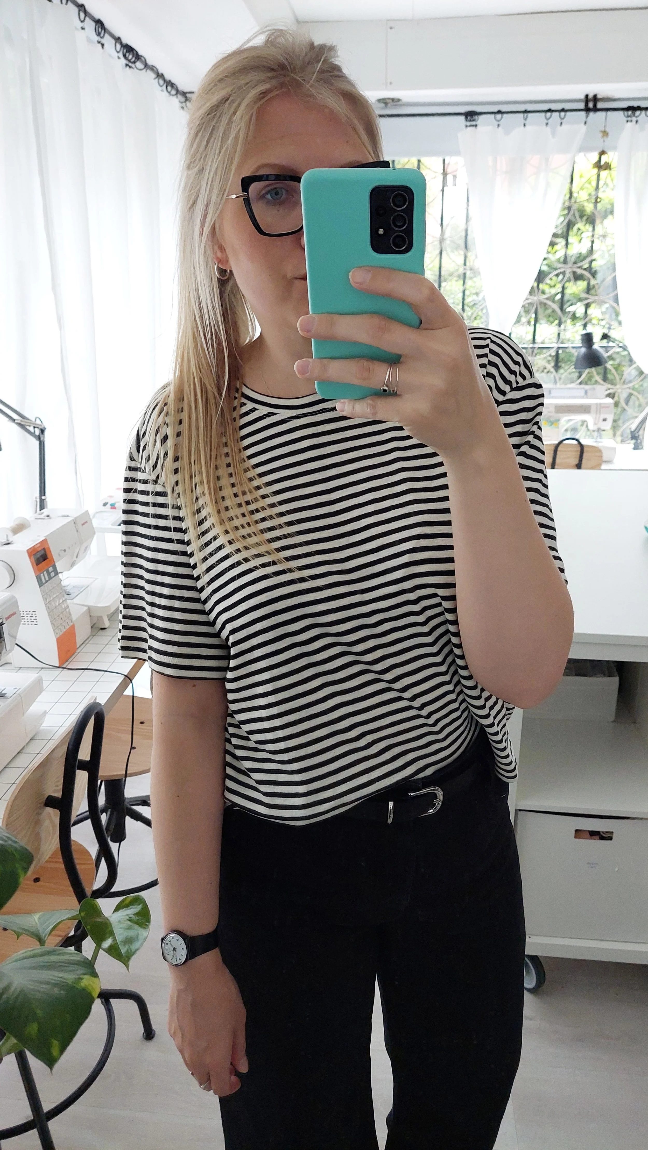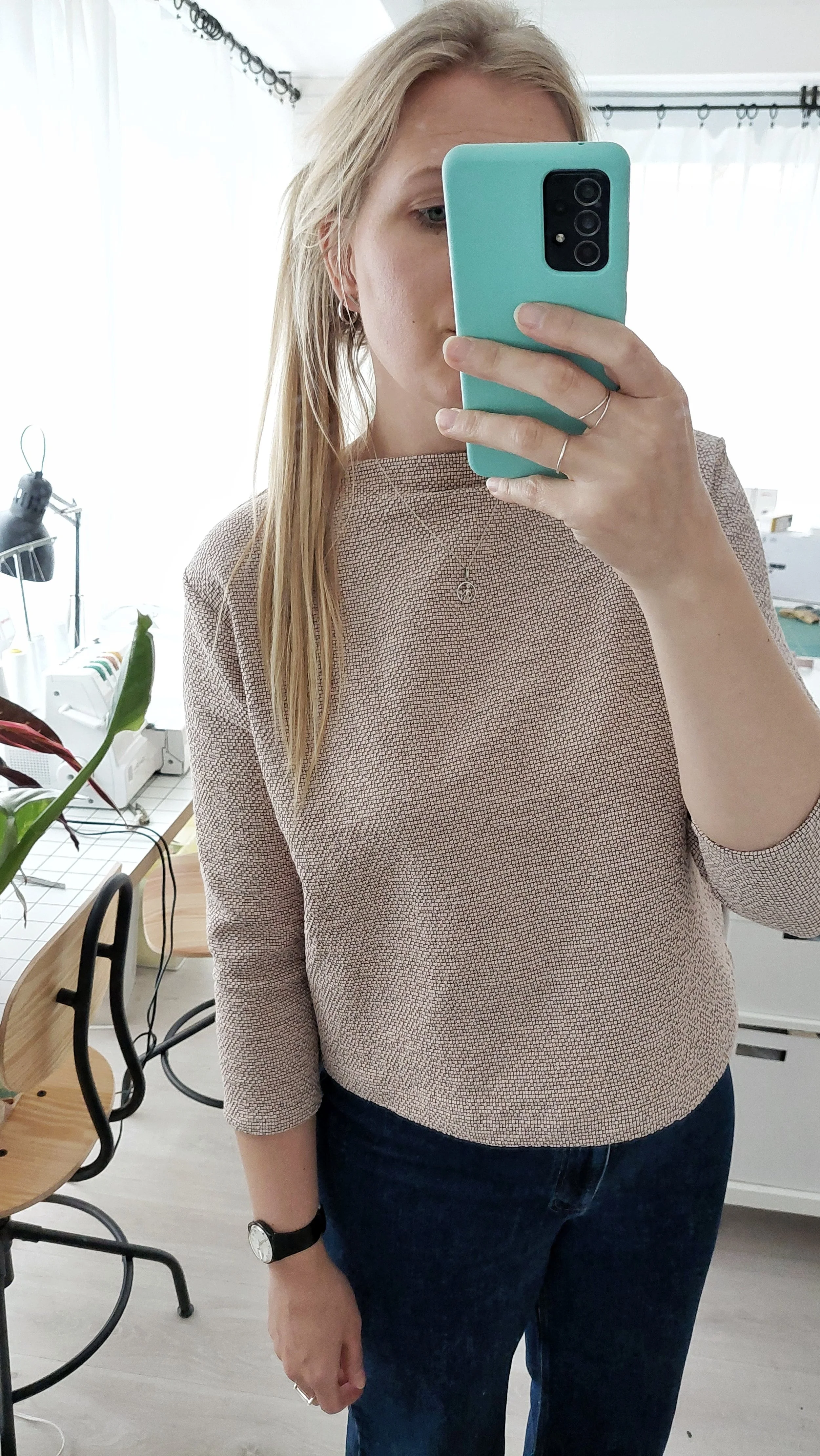 También copié otro top de manga larga cosida con este punto de rayas con la composición desconocida (de Teixits i Retalls), intentando hacer coincidir las rayas, lo cual no fue una tarea fácil, ya que no eran nada rectas. Tenía bastante tela, así que también la utilicé como prueba para la camiseta Jesse, un patrón gratuito de True Bias. Y hubo un top más de manga larga, usando una tela que tiene una textura de cuadraditos que me gusta mucho, llevaba un buen rato en el armario desde que lo compré.