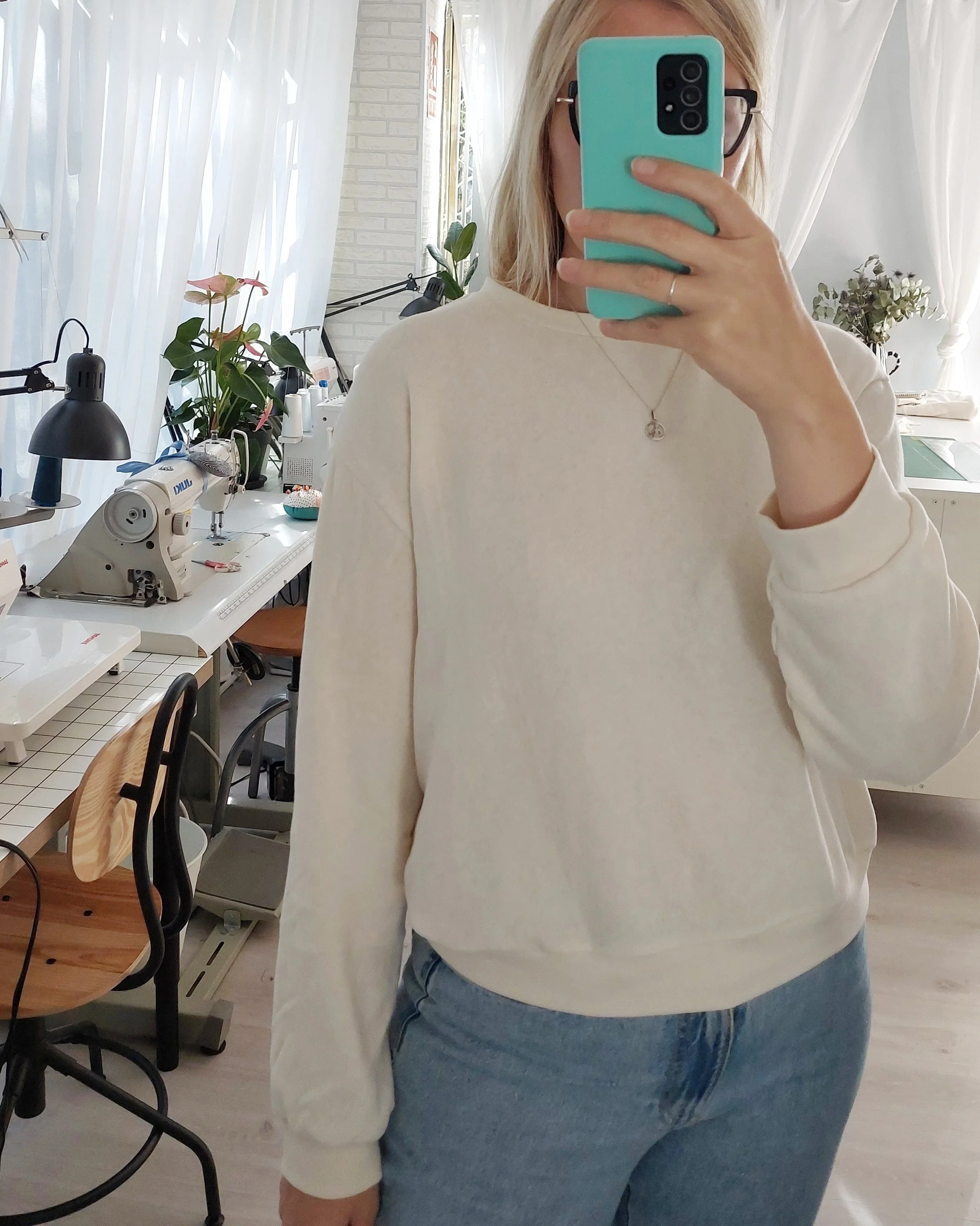 Right now, I mostly wear these with an off-white sweatshirt I made during the patternmaking program. I used a mystery knit fabric I once got from a remnant sale from a lingerie manufacturer, and I’d say it has some wool in the composition—it’s just so nice and warm, but not in a polyester kind of way. These two don’t match in color, but they match in my interests (comfort!), so I consider that a win, haha.