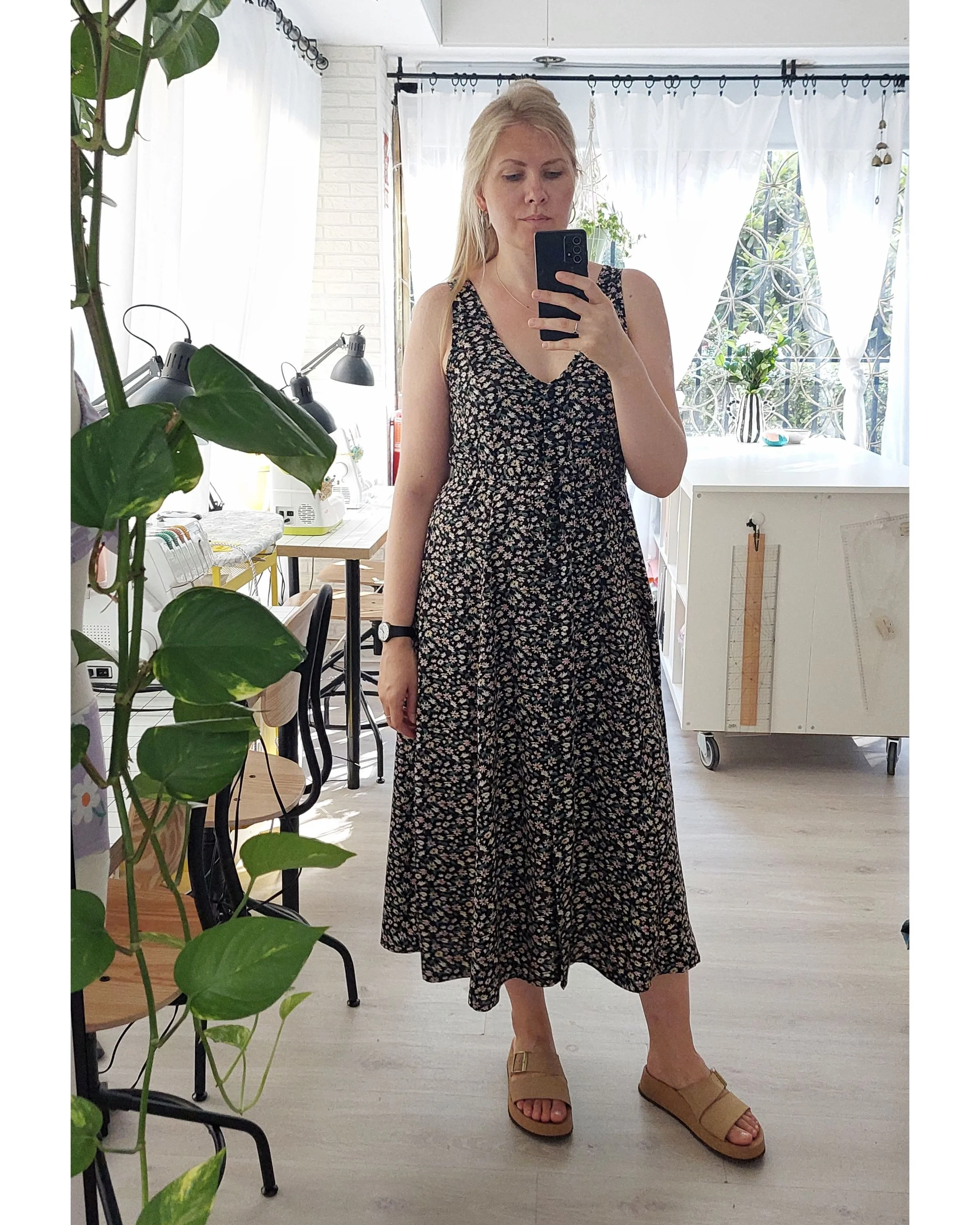 Solo hice un vestido, pero lo usé muchísimo. El patrón es una copia de un vestido comprado que ya he usado un par de veces para otros vestidos similares, y la tela es otra viscosa con mucha caída de Encants.