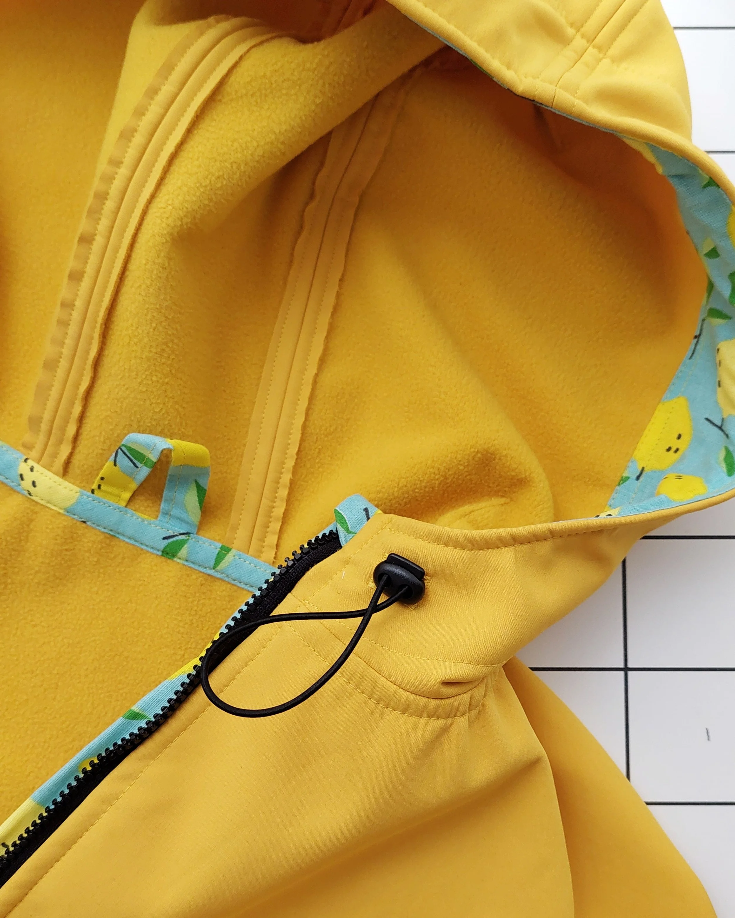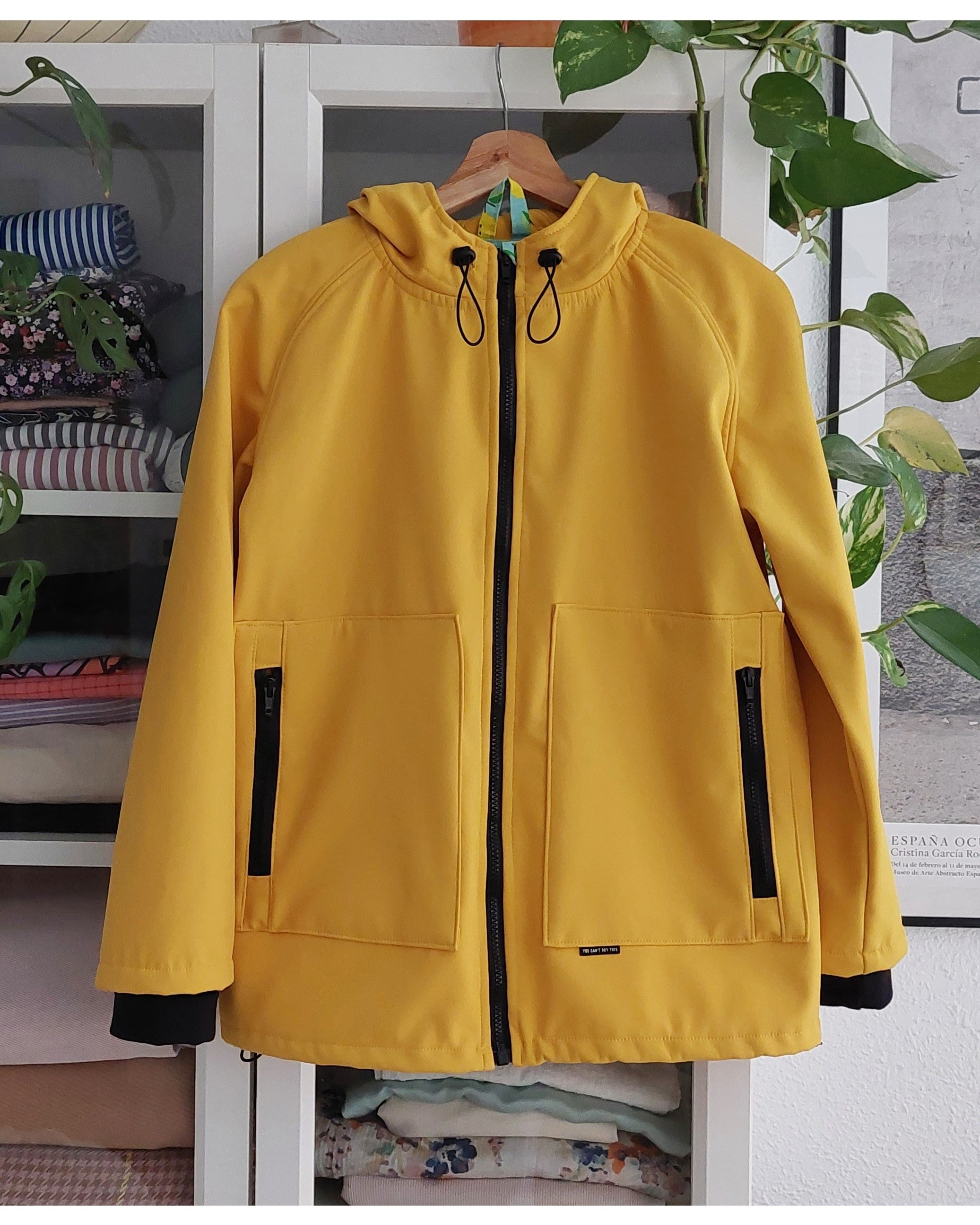 Se le había quedado pequeña la chaqueta softshell, así que le hice una nueva, en amarillo, tal y como me pidió. Es una chaqueta muy chula, pero me costó mucho más trabajo conseguir que todo quedara bien con una tela lisa y de color claro como esta. Las costuras son muy visibles, y un estampado pequeño no estaría mal para ocultar algunos errores, jeje. Al final, pedí la tela a Takoy (Eslovaquia), ya que ninguna otra tienda aquí en España tenía softshell amarillo. El patrón es uno muy modificado de Ottobre Design 2023/1.