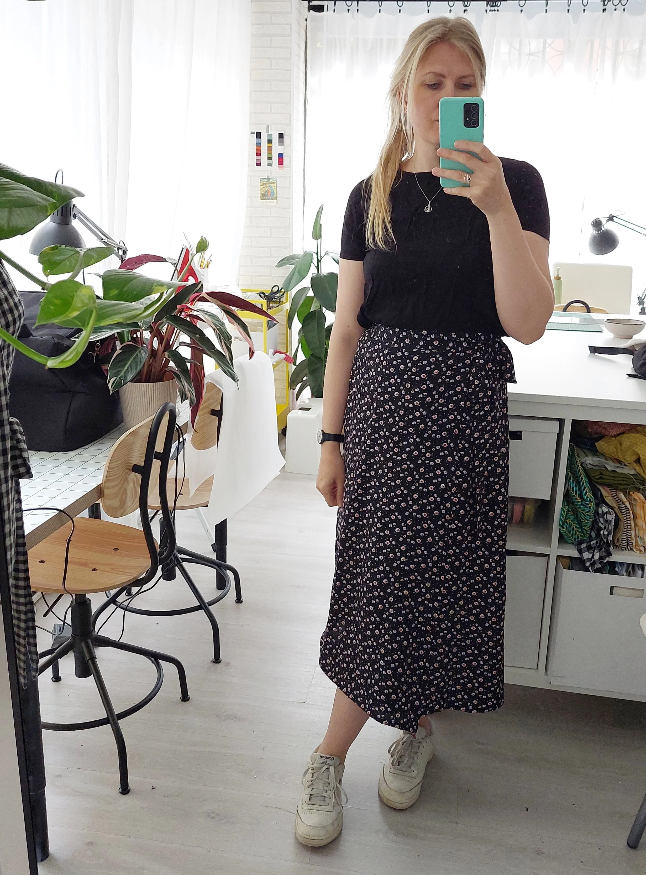 Otra falda que me puse mucho este verano fue esta falda cruzada con estampado floral. El patrón es el Peppermint Wrap Skirt de Peppermint Magazine, diseñado por In the Folds. La tela es una viscosa fluida que compré en Encants, y también me sobró suficiente para hacer una blusa Donna (un patrón de La Maison Victor). Me gustaría hacer más faldas cruzadas como esta, quizá otra recta en un color liso y otra con más vuelo con algún estampado. Las faldas cruzadas van genial para los cambios en las medidas del cuerpo (hola, una medida por la mañana, y otra 4 cm más grande por la noche), así que siempre tengo la siguiente en mi lista de cosas que coser.