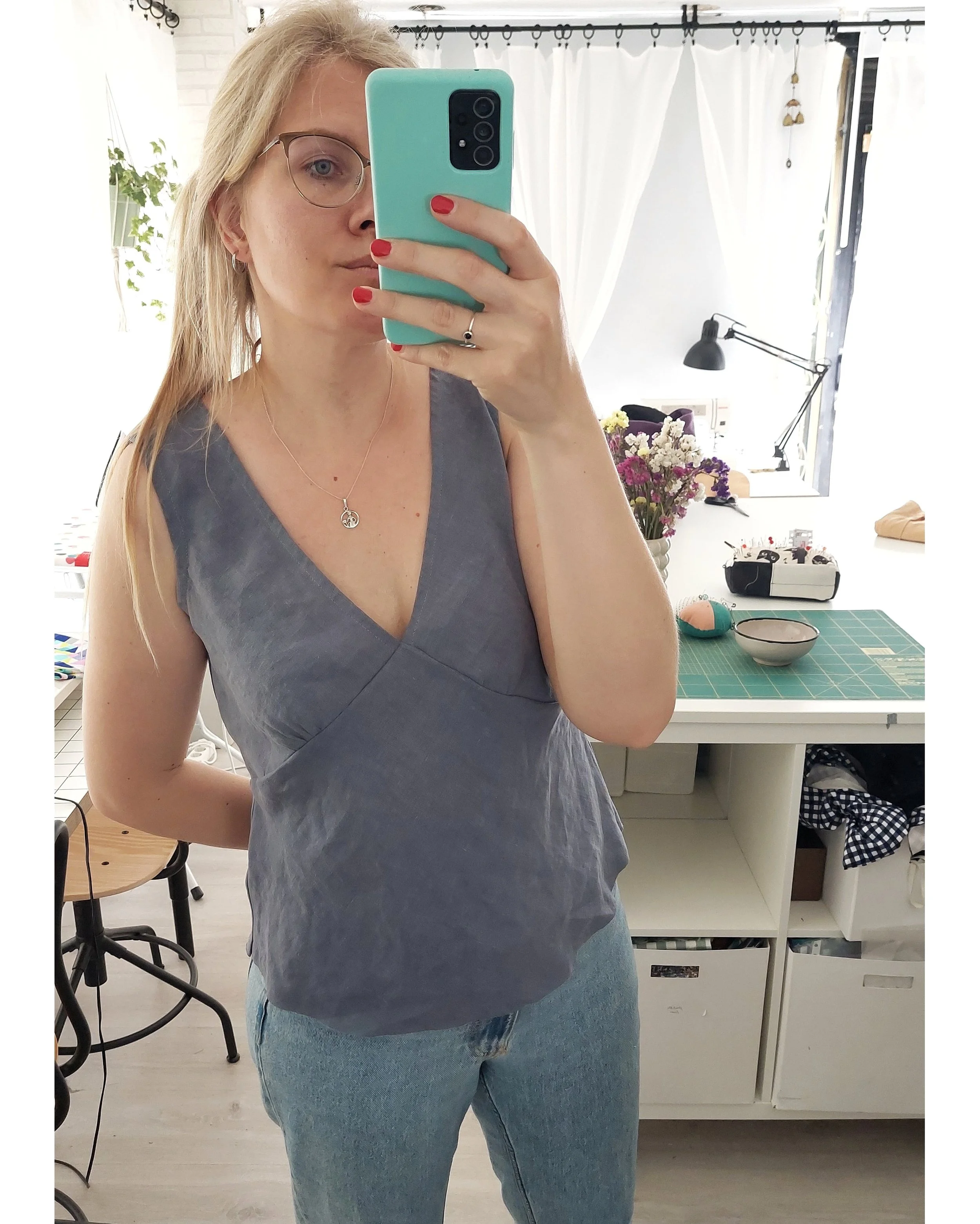 Esta blusa de patrón Gibbons de Elbe Textiles, cortada al bies, la hice a partir de otro proyecto ya existente de un vestido de lino al bies que al final no me gustó. La blusa me gusta en las fotos, pero no me entusiasma en la vida real; ya veremos qué tal me sienta después de la hibernación invernal, jeje.