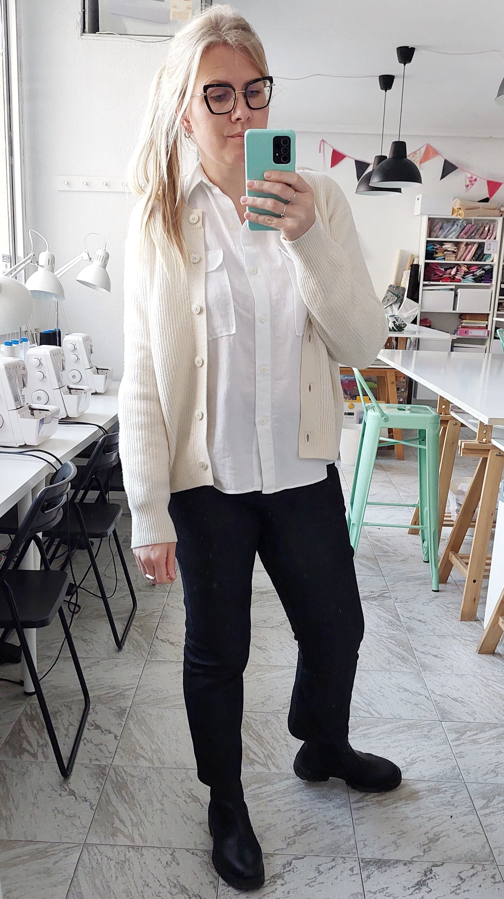 Ahora mismo, los uso principalmente con una sudadera en blanco roto que hice durante el curso de patronaje como ejercicio. Usé un punto misterioso que compré una vez en una venta de restos de un fabricante de lencería, y diría que tiene algo de lana en su composición, ya que es muy agradable y cálido, pero no como el poliéster. Estos dos no combinan en color en absoluto, pero sí en mis intereses (la comodidad!), así que lo considero un acierto, jaja.