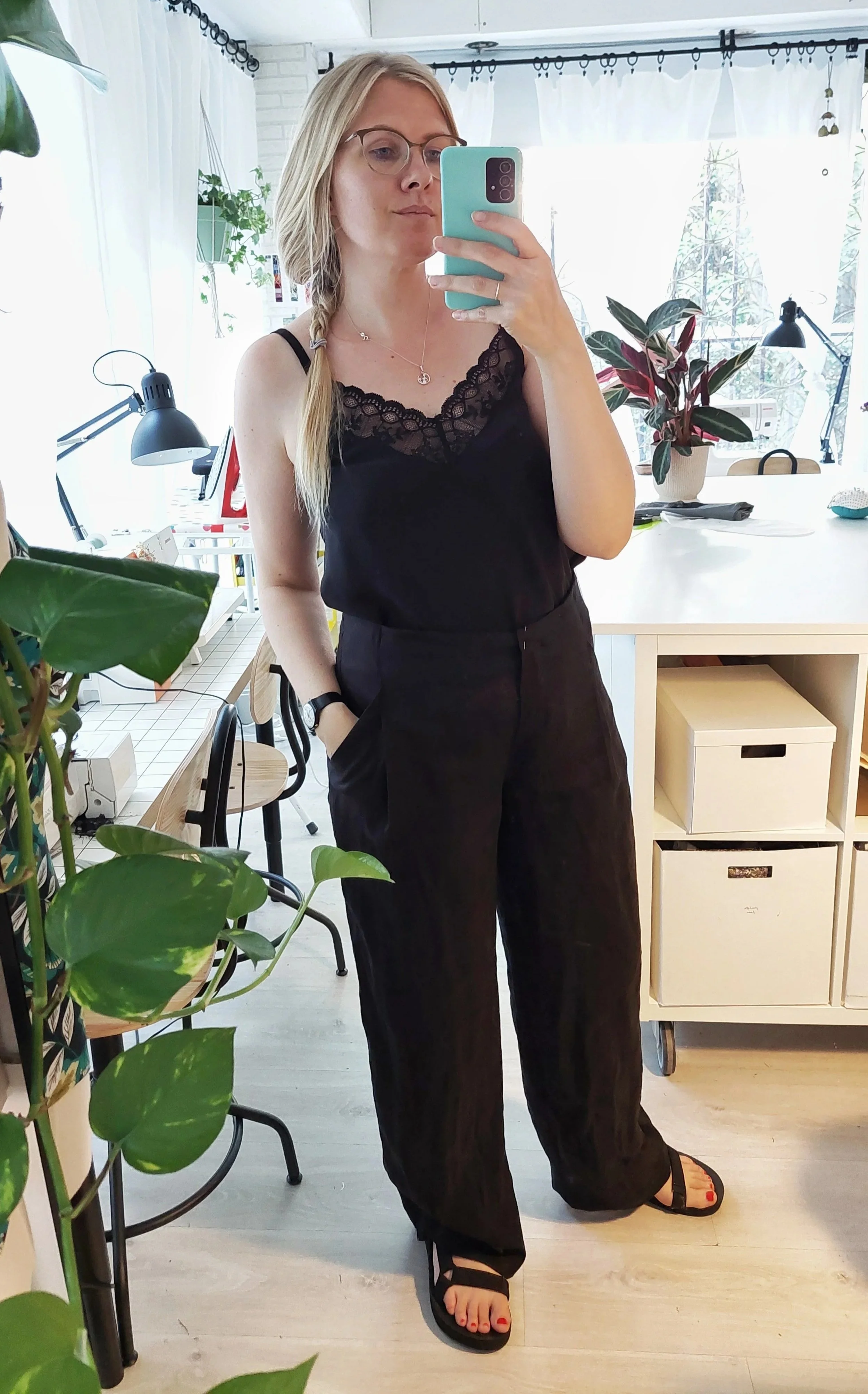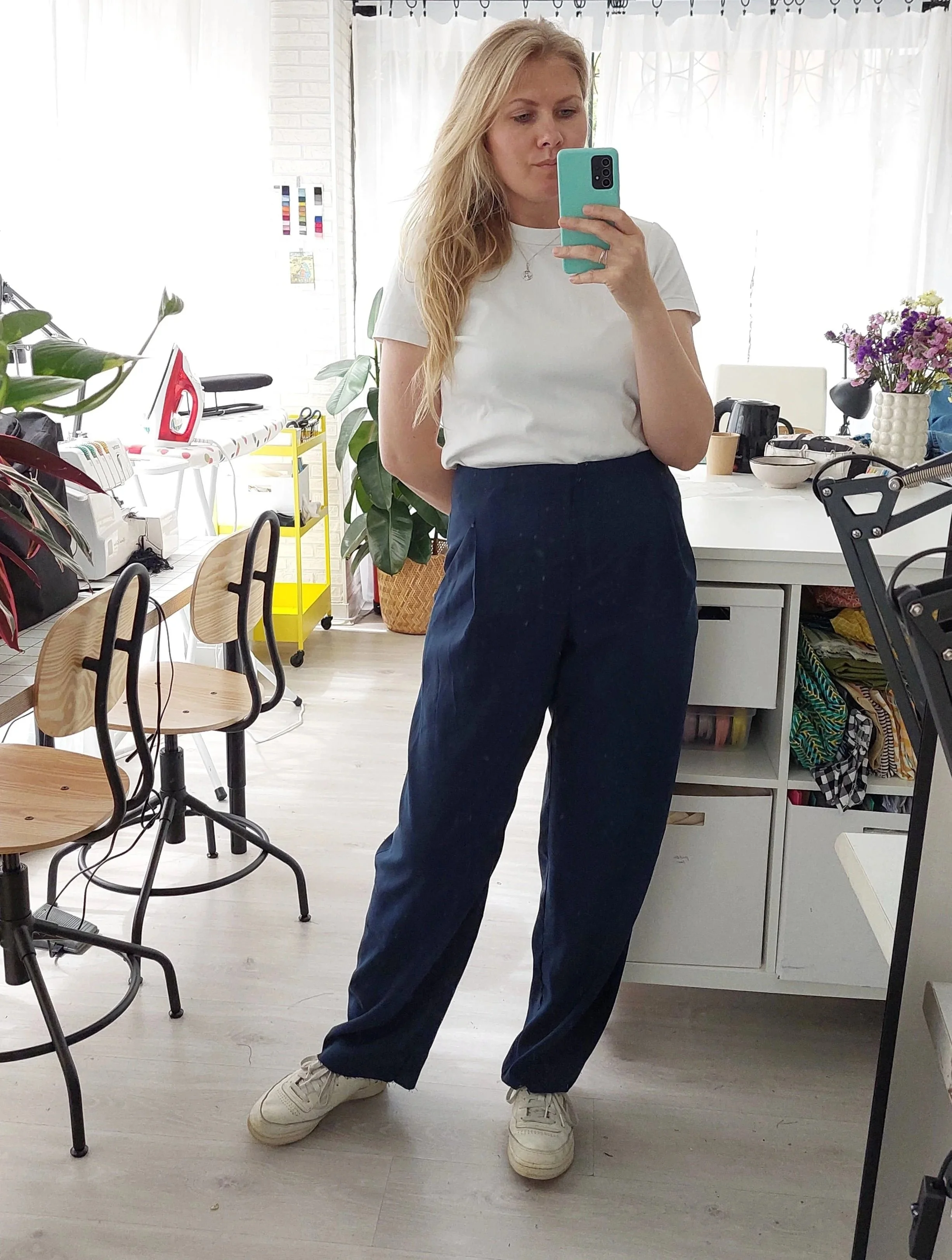Hice dos pares de pantalones Mitchell, un patrón de Closet Core. Me gusta mucho este tipo de pliegues y la confección de la cintura con acabado de vista en vez de cinturilla. El par azul está hecho con sarga de Tencel (de Ribes i Casals) y el negro con lino de Teixits i Retalls. Nunca había tenido pantalones anchos como estos, y este experimento me ha abierto un mundo nuevo en cuanto a pantalones, especialmente para el verano. Las temperaturas son muy altas en Madrid, y hasta que hice estos pantalones no tenía ninguno bueno para llevar con el calor, así que estoy contenta de tener algunas alternativas a los vestidos y las faldas.