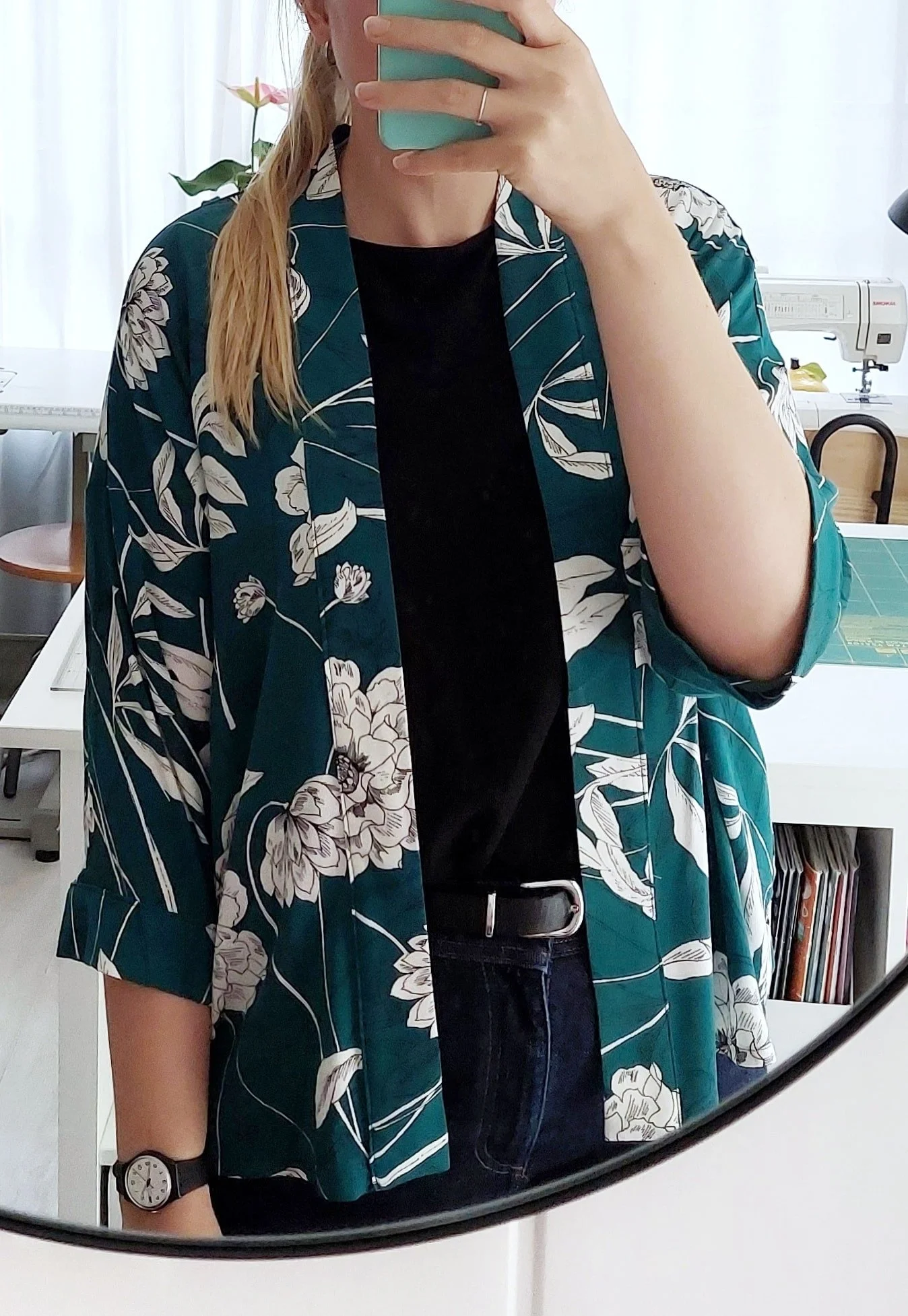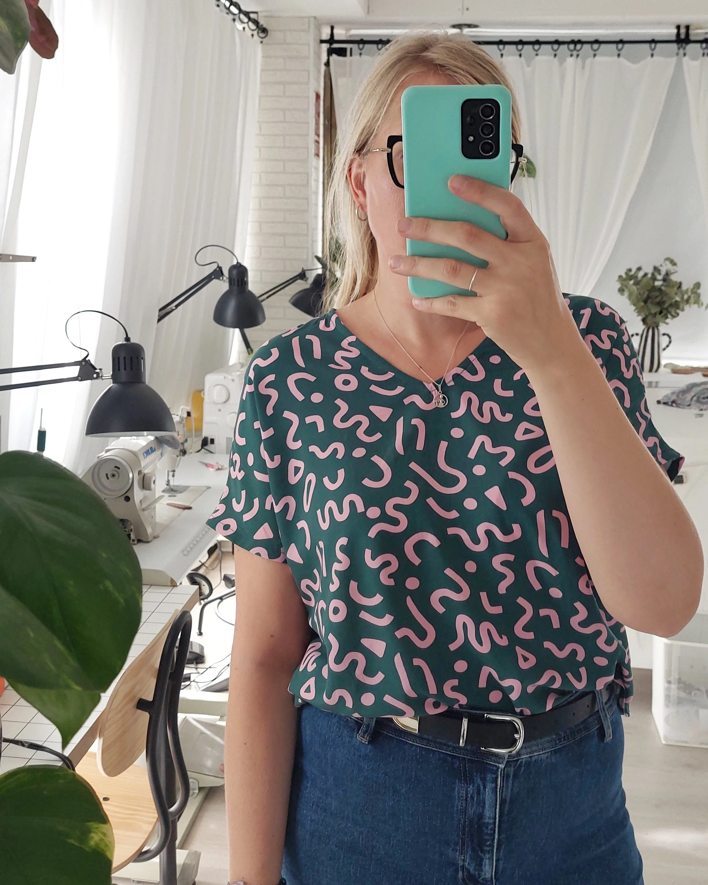 This floral boat-neck blouse, the drop-shoulder top, and a jacket (all made in viscose) were patternmaking exercises during my studies this fall.