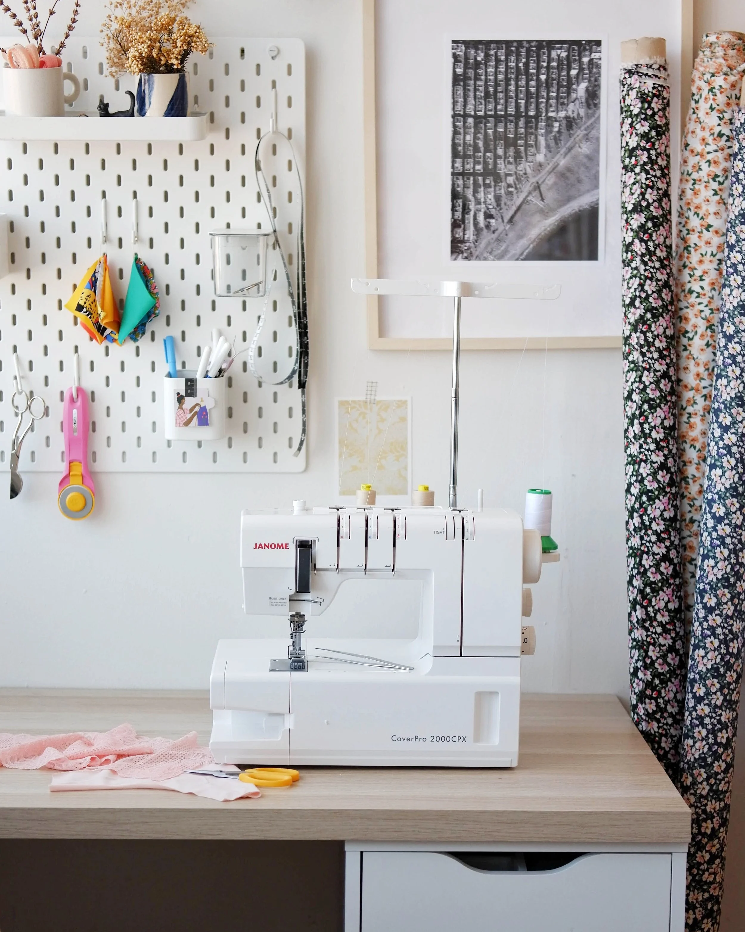 La recubridora sirve para hacer dobladillos (principalmente) en tejidos de punto con una puntada elástica sencilla, doble o triple. Mi recubridora es la Janome CoverPro 2000CPX y puedes utilizarla en clase.